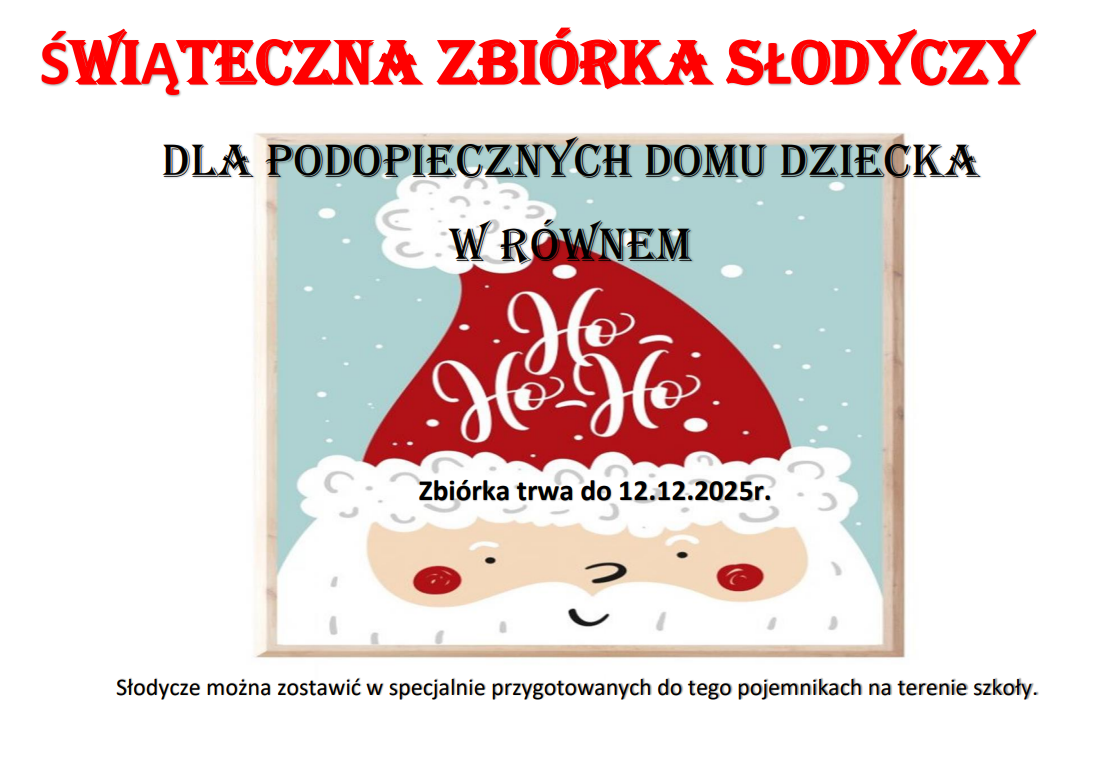Właśnie ruszyła coroczna zbiórka słodyczy dla dzieci z Domu Dziecka w Równem. Święta Bożego Narodzenia to czas, kiedy oprócz wspólnych spotkań przy wigilijnym stole, towarzyszy nam tradycja przekazywania prezentów. Niestety nie wszyscy mogą tego doświadczyć. Dlatego zbieramy to, z czego nasi uczniowie "jeden raz" mogą zrezygnować, aby innym sprawić choć małą namiastkę świątecznej atmosfery. Jest to też okazja do nauczenia naszych uczniów dzielenia się, wrażliwości i empatii. Akcja trwa do 12.12.2025r. Co zbieramy? Wszelkie słodkości tj. cukierki, batony, czekolady itp. Świąteczny "worek", do którego można wrzucać słodycze znajduje się na parterze przy wejściu w budynku A i B.